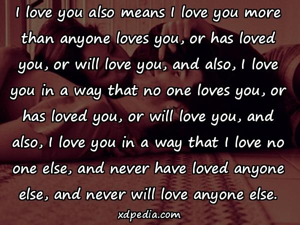 I love you also means I love you more than anyone loves you, or has loved you, or will love you, and also, I love you in a way that no one loves you, or has loved you, or will love you, and also, I love you in a way that I love no one else, and never have loved anyone else, and never will love anyone else.